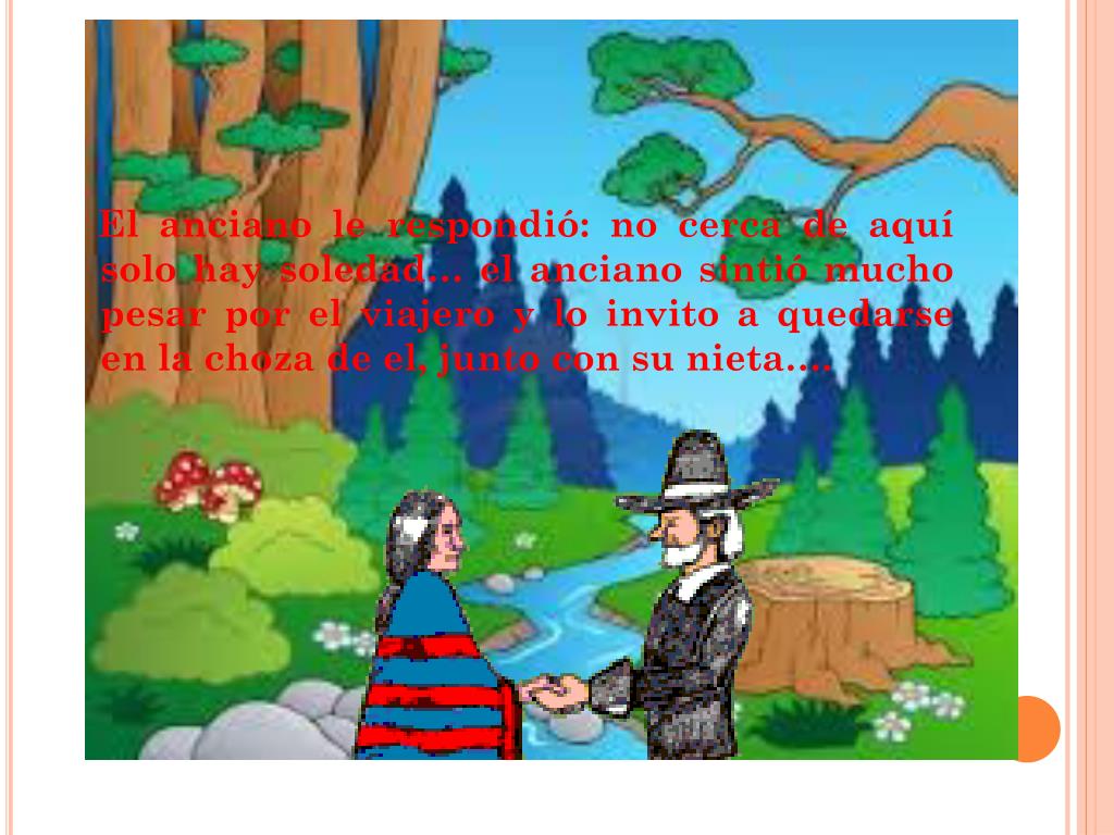 El viejito humilde. Un día el viejito y su nieta salieron a ver a la puerta, y en el camino vieron viajero. . Al ver al anciano y a su nieta el viajero los saludo y les dijo: “existe un hotel cerca de aquí ”.