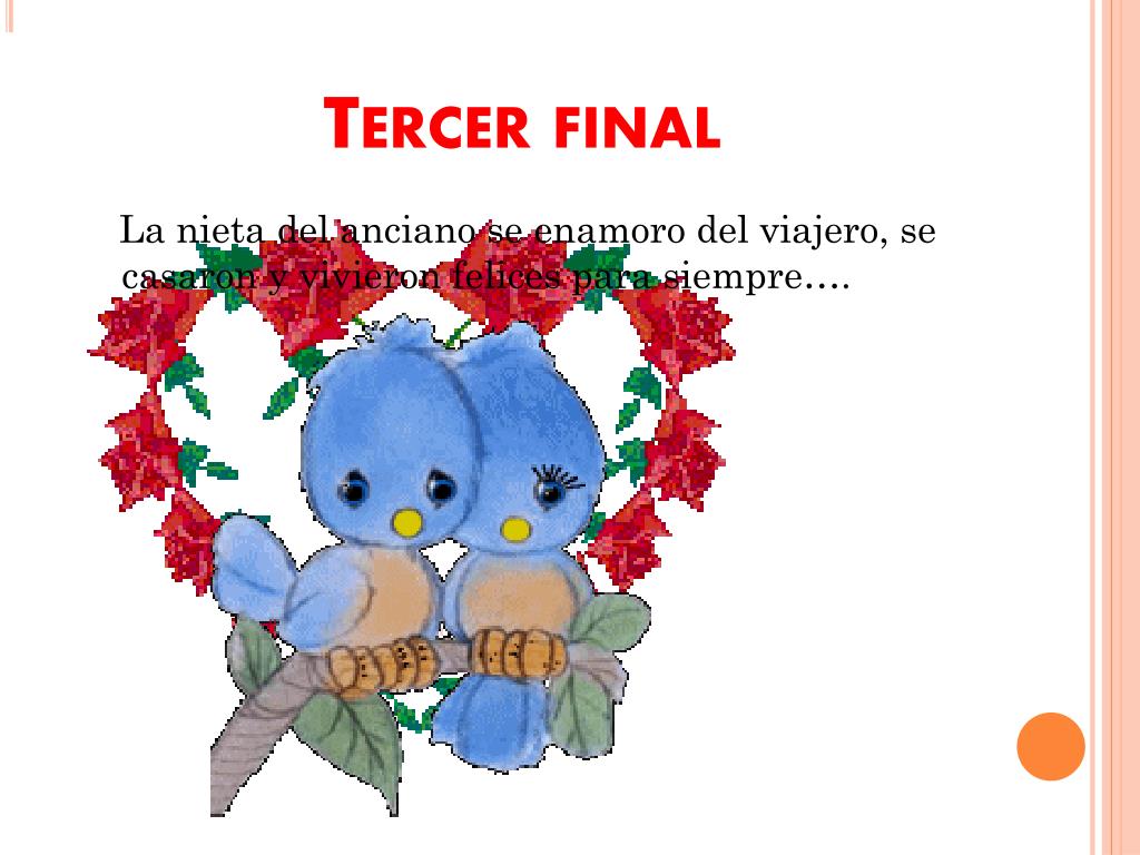 Tercer final La nieta del anciano se enamoro del viajero, se casaron y vivieron felices para siempre….