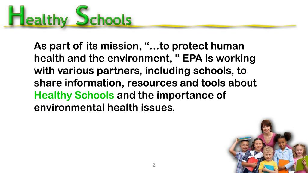 As part of its mission, “…to protect human health and the environment, ” EPA is working with various partners, including schools, to share information, resources and tools about Healthy Schools and the importance of environmental health issues. 2