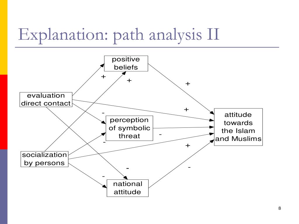 Explanation: regression analysis • Predictors attitude towards the Islam and Muslims: • Evaluation of direct contact • Perceived symbolic threat • Perceived attitude personal socializers • Positive beliefs • National identification • Gender • Religiosity • Explained variance: 71.5 percent