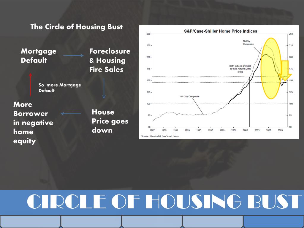 The Circle of Housing Bust Mortgage Default Foreclosure & Housing Fire Sales So more Mortgage Default More Borrower in negative home equity House Price goes down CIRCLE OF HOUSING BUST