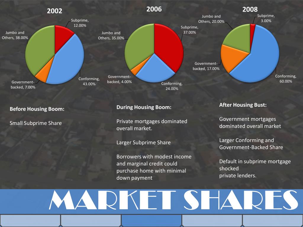 After Housing Bust: Government mortgages dominated overall market Larger Conforming and Government-Backed Share Default in subprime mortgage shocked private lenders. Before Housing Boom: Small Subprime Share During Housing Boom: Private mortgages dominated overall market. Larger Subprime Share Borrowers with modest income and marginal credit could purchase home with minimal down payment MARKET SHARES