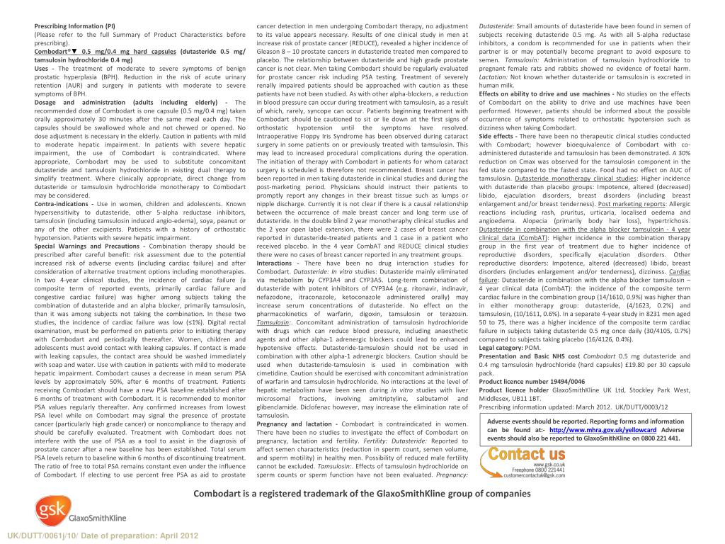 Prescribing Information (PI) (Please refer to the full Summary of Product Characteristics before prescribing). Combodart®▼0.5 mg/0.4 mg hard capsules (dutasteride 0.5 mg/ tamsulosinhydrochloride 0.4 mg) Uses - The treatment of moderate to severe symptoms of benign prostatic hyperplasia (BPH). Reduction in the risk of acute urinary retention (AUR) and surgery in patients with moderate to severe symptoms of BPH. Dosage and administration (adults including elderly) - The recommended dose of Combodart is one capsule (0.5 mg/0.4 mg) taken orally approximately 30 minutes after the same meal each day. The capsules should be swallowed whole and not chewed or opened. No dose adjustment is necessary in the elderly. Caution in patients with mild to moderate hepatic impairment. In patients with severe hepatic impairment, the use of Combodart is contraindicated. Where appropriate, Combodart may be used to substitute concomitant dutasteride and tamsulosin hydrochloride in existing dual therapy to simplify treatment. Where clinically appropriate, direct change from dutasteride or tamsulosin hydrochloride monotherapy to Combodart may be considered. Contra-indications-Use in women, children and adolescents. Known hypersensitivity to dutasteride, other 5-alpha reductase inhibitors, tamsulosin (including tamsulosin induced angio-edema), soya, peanut or any of the other excipients. Patients with a history of orthostatic hypotension. Patients with severe hepatic impairment. Special Warnings and Precautions - Combination therapy should be prescribed after careful benefit: risk assessment due to the potential increased risk of adverse events (including cardiac failure) and after consideration of alternative treatment options including monotherapies. In two 4-year clinical studies, the incidence of cardiac failure (a composite term of reported events, primarily cardiac failure and congestive cardiac failure) was higher among subjects taking the combination of dutasteride and an alpha blocker, primarily tamsulosin, than it was among subjects not taking the combination. In these two studies, the incidence of cardiac failure was low (≤1%). Digital rectal examination, must be performed on patients prior to initiating therapy with Combodart and periodically thereafter. Women, children and adolescents must avoid contact with leaking capsules. If contact is made with leaking capsules, the contact area should be washed immediately with soap and water. Use with caution in patients with mild to moderate hepatic impairment. Combodart causes a decrease in mean serum PSA levels by approximately 50%, after 6 months of treatment. Patients receiving Combodart should have a new PSA baseline established after 6 months of treatment with Combodart. It is recommended to monitor PSA values regularly thereafter. Any confirmed increases from lowest PSA level while on Combodart may signal the presence of prostate cancer (particularly high grade cancer) or noncompliance to therapy and should be carefully evaluated. Treatment with Combodart does not interfere with the use of PSA as a tool to assist in the diagnosis of prostate cancer after a new baseline has been established. Total serum PSA levels return to baseline within 6 months of discontinuing treatment. The ratio of free to total PSA remains constant even under the influence of Combodart. If electing to use percent free PSA as aid to prostate cancer detection in men undergoing Combodart therapy, no adjustment to its value appears necessary. Results of one clinical study in men at increase risk of prostate cancer (REDUCE), revealed a higher incidence of Gleason 8 – 10 prostate cancers in dutasteride treated men compared to placebo. The relationship between dutasteride and high grade prostate cancer is not clear. Men taking Combodart should be regularly evaluated for prostate cancer risk including PSA testing. Treatment of severely renally impaired patients should be approached with caution as these patients have not been studied. As with other alpha-blockers, a reduction in blood pressure can occur during treatment with tamsulosin, as a result of which, rarely, syncope can occur. Patients beginning treatment with Combodart should be cautioned to sit or lie down at the first signs of orthostatic hypotension until the symptoms have resolved. Intraoperative Floppy Iris Syndrome has been observed during cataract surgery in some patients on or previously treated with tamsulosin. This may lead to increased procedural complications during the operation. The initiation of therapy with Combodart in patients for whom cataract surgery is scheduled is therefore not recommended. Breast cancer has been reported in men taking dutasteride in clinical studies and during the post-marketing period. Physicians should instruct their patients to promptly report any changes in their breast tissue such as lumps or nipple discharge. Currently it is not clear if there is a causal relationship between the occurrence of male breast cancer and long term use of dutasteride. In the double blind 2 year monotheraphy clinical studies and the 2 year open label extension, there were 2 cases of breast cancer reported in dutasteride-treated patients and 1 case in a patient who received placebo. In the 4 year CombAT and REDUCE clinical studies there were no cases of breast cancer reported in any treatment groups. Interactions - There have been no drug interaction studies for Combodart.Dutasteride:In vitro studies: Dutasteride mainly eliminated via metabolism by CYP3A4 and CYP3A5. Long-term combination of dutasteride with potent inhibitors of CYP3A4 (e.g. ritonavir, indinavir, nefazodone, itraconazole, ketoconazole administered orally) may increase serum concentrations of dutasteride. No effect on the pharmacokinetics of warfarin, digoxin, tamsulosin or terazosin. Tamsulosin:. Concomitant administration of tamsulosin hydrochloride with drugs which can reduce blood pressure, including anaesthetic agents and other a