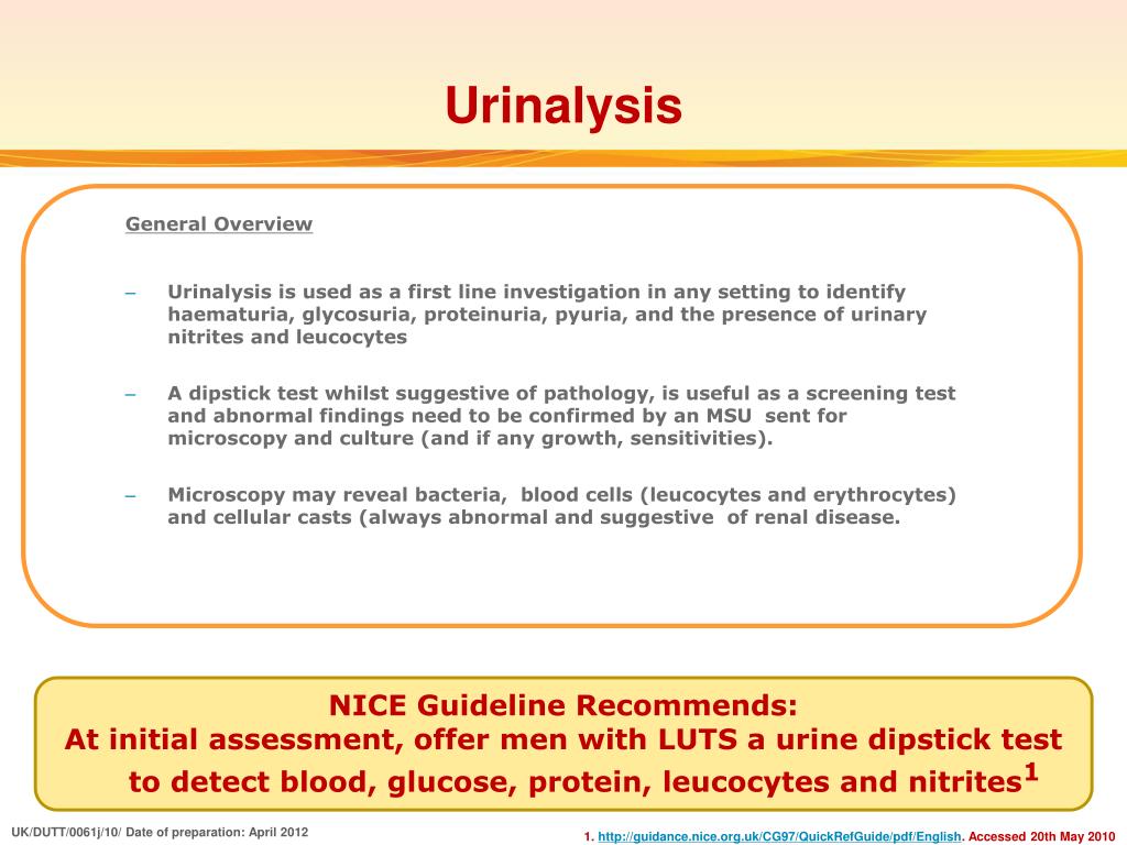 Urinalysis General Overview • Urinalysis is used as a first line investigation in any setting to identify haematuria, glycosuria, proteinuria, pyuria, and the presence of urinary nitrites and leucocytes • A dipstick test whilst suggestive of pathology, is useful as a screening test and abnormal findings need to be confirmed by an MSU sent for microscopy and culture (and if any growth, sensitivities). • Microscopy may reveal bacteria, blood cells (leucocytes and erythrocytes) and cellular casts (always abnormal and suggestive of renal disease. • NICE Guideline Recommends: • At initial assessment, offer men with LUTS a urine dipstick test to detect blood, glucose, protein, leucocytes and nitrites1 UK/DUTT/0061j/10/ Date of preparation: April 2012 1. http://guidance.nice.org.uk/CG97/QuickRefGuide/pdf/English. Accessed 20th May 2010