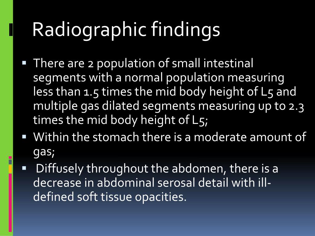 There are 2 population of small intestinal segments with a normal population measuring less than 1.5 times the mid body height of L5 and multiple gas dilated segments measuring up to 2.3 times the mid body height of L5; • Within the stomach there is a moderate amount of gas; • Diffusely throughout the abdomen, there is a decrease in abdominal serosal detail with ill-defined soft tissue opacities. Radiographic findings
