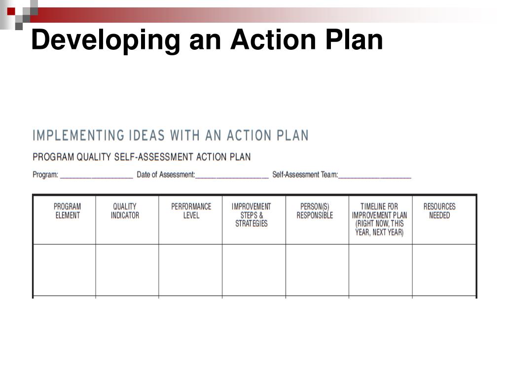 Continuous Improvement • Programs should know: • Staff skill sets • What other skills do they need? • PD can be offered through a variety of venues: • program observations; • peer mentoring/coaching; • supervision; • staff meetings; • conferences; • networking events; and • higher education courses. • RESOURCE: PASE Professional Development Planning Tool