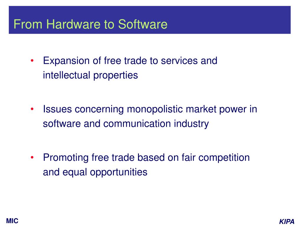 From Hardware to Software • Expansion of free trade to services and intellectual properties • Issues concerning monopolistic market power in software and communication industry • Promoting free trade based on fair competition and equal opportunities