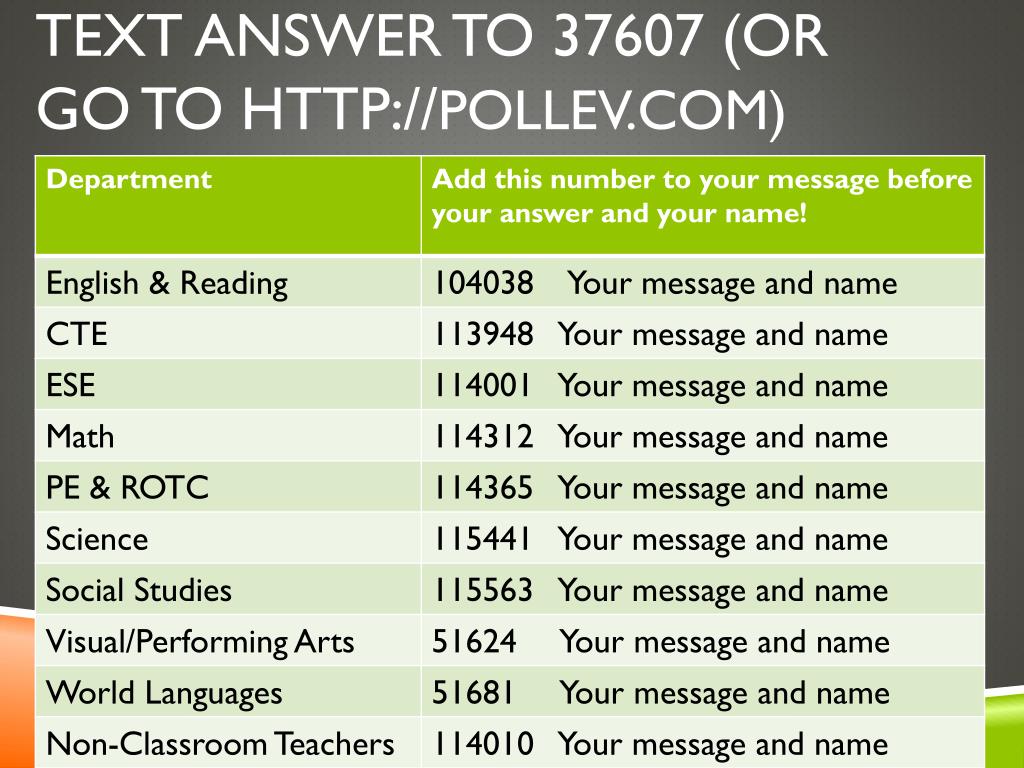 Exit Slips • We will be using Poll Everywhere for our Exit Slips today so that you can see what a short answer poll would look like! • The only difference when you respond to a short answer question in Poll Everywhere is that you need to add a number to the beginning of your answer. We would also like you to add your name to the end of your answer.