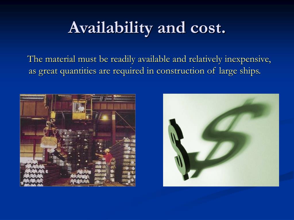Availability and cost. The material must be readily available and relatively inexpensive, as great quantities are required in construction of large ships.