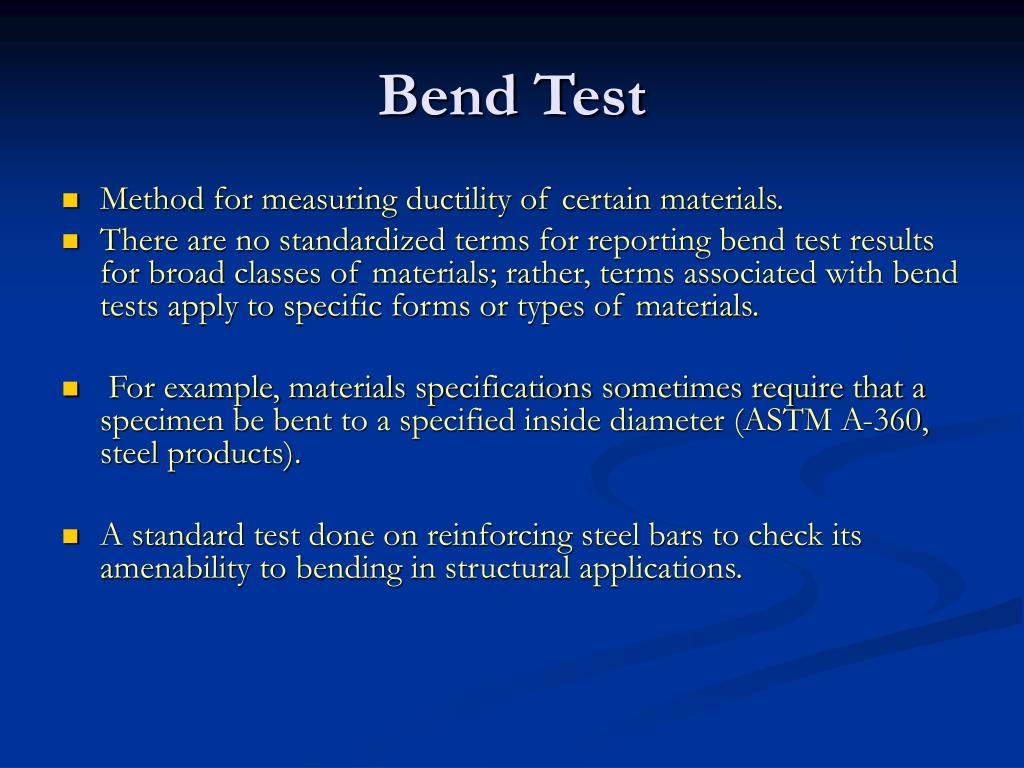 Bend Test • Method for measuring ductility of certain materials. • There are no standardized terms for reporting bend test results for broad classes of materials; rather, terms associated with bend tests apply to specific forms or types of materials. • For example, materials specifications sometimes require that a specimen be bent to a specified inside diameter (ASTM A-360, steel products). • A standard test done on reinforcing steel bars to check its amenability to bending in structural applications.