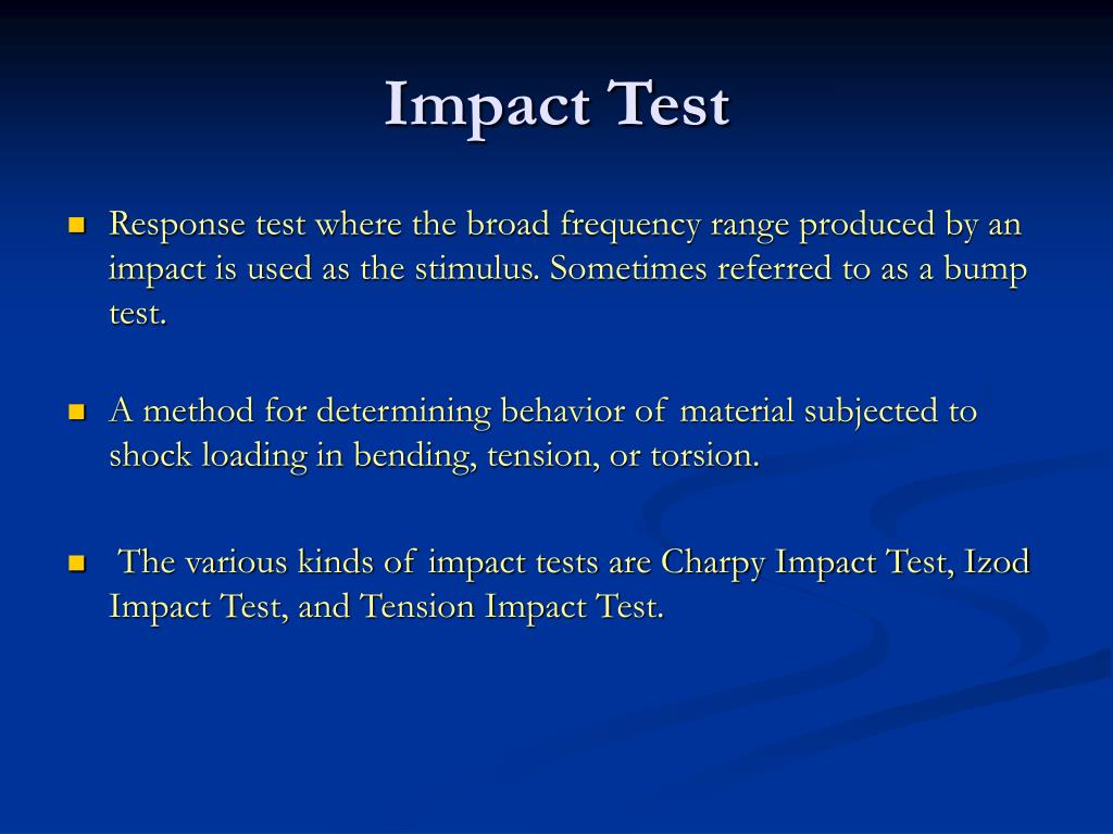 Impact Test • Response test where the broad frequency range produced by an impact is used as the stimulus. Sometimes referred to as a bump test. • A method for determining behavior of material subjected to shock loading in bending, tension, or torsion. • The various kinds of impact tests are Charpy Impact Test, Izod Impact Test, and Tension Impact Test.