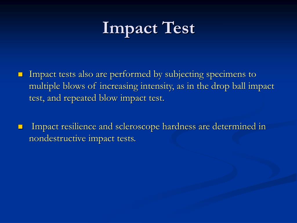 Impact Test • Impact tests also are performed by subjecting specimens to multiple blows of increasing intensity, as in the drop ball impact test, and repeated blow impact test. • Impact resilience and scleroscope hardness are determined in nondestructive impact tests.