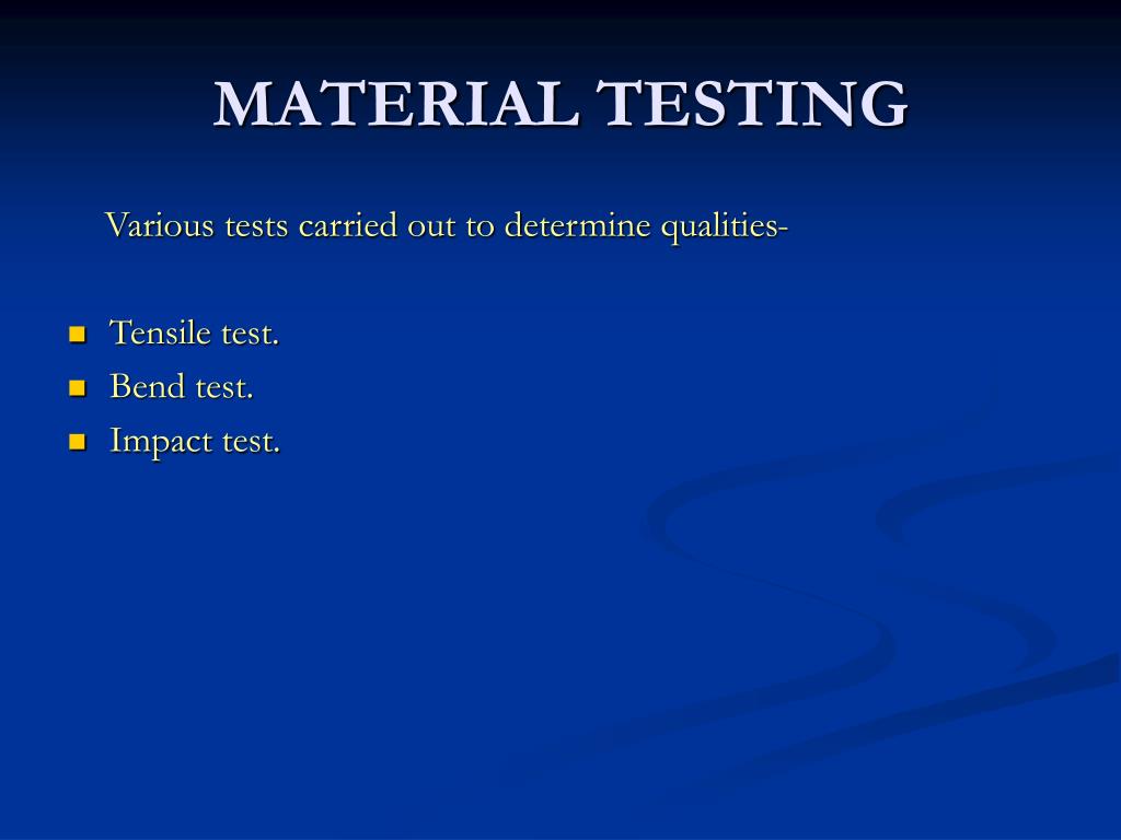 MATERIAL TESTING Various tests carried out to determine qualities- • Tensile test. • Bend test. • Impact test.