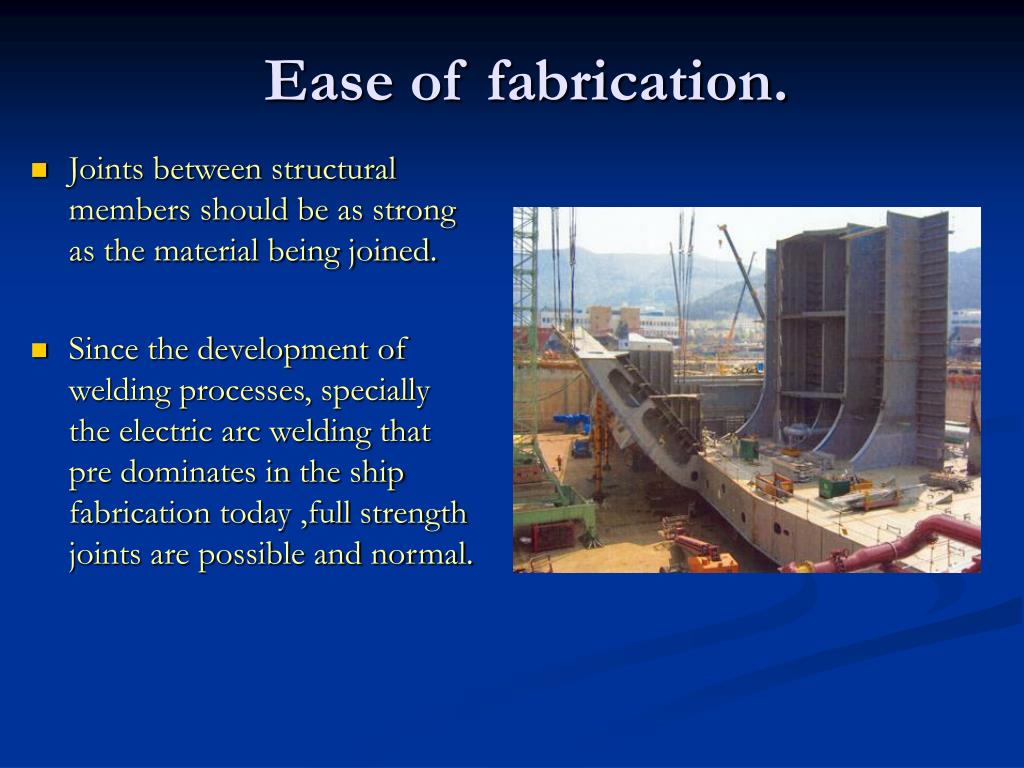 Ease of fabrication. • Joints between structural members should be as strong as the material being joined. • Since the development of welding processes, specially the electric arc welding that pre dominates in the ship fabrication today ,full strength joints are possible and normal.