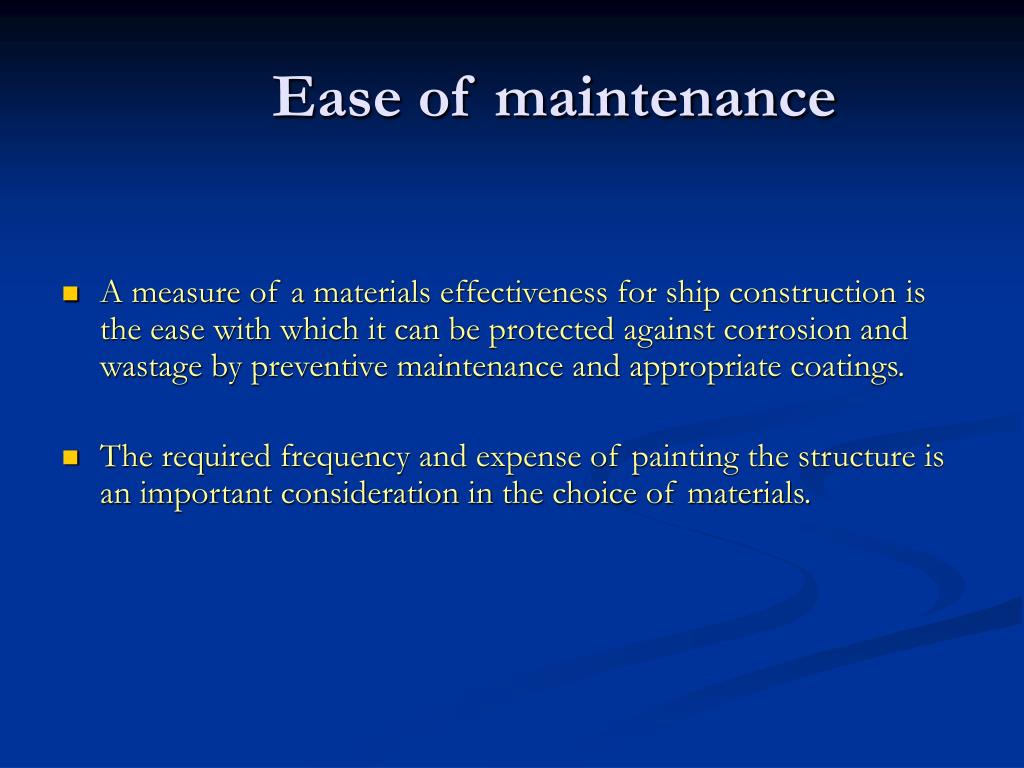 Ease of maintenance • A measure of a materials effectiveness for ship construction is the ease with which it can be protected against corrosion and wastage by preventive maintenance and appropriate coatings. • The required frequency and expense of painting the structure is an important consideration in the choice of materials.