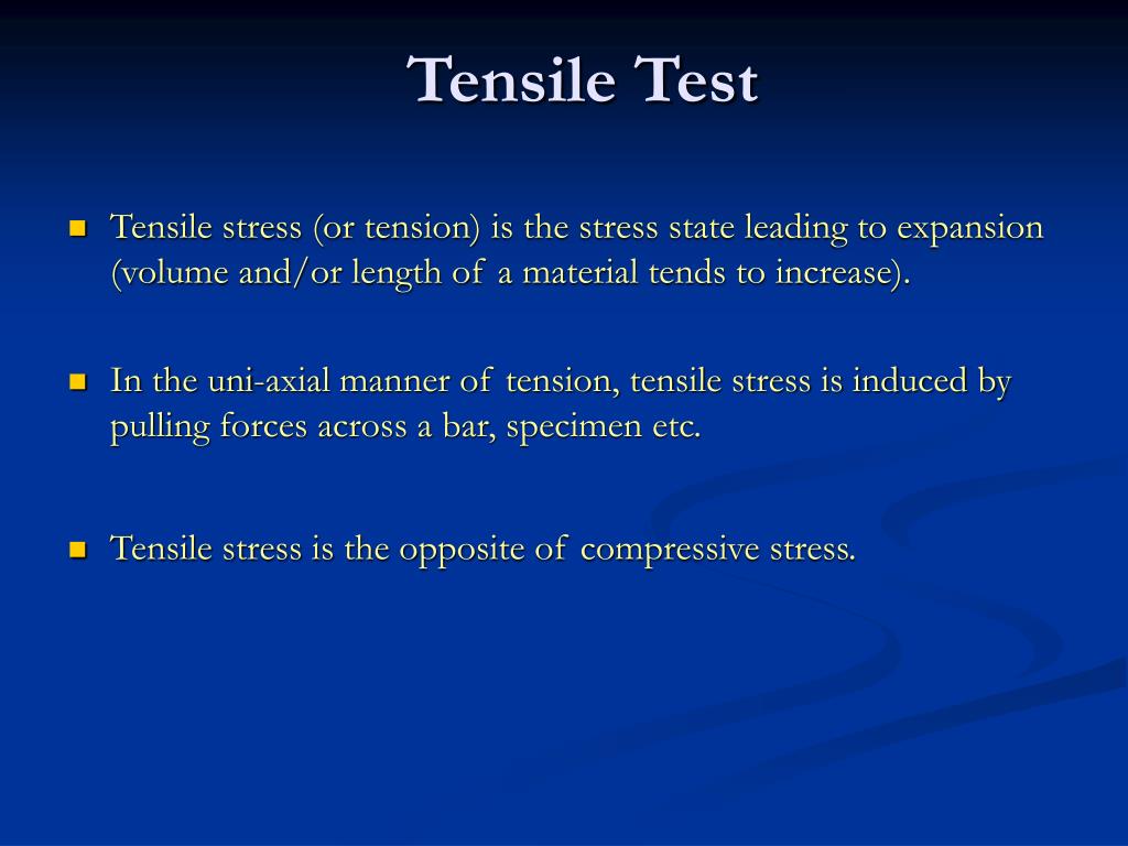 Tensile Test • Tensile stress (or tension) is the stress state leading to expansion (volume and/or length of a material tends to increase). • In the uni-axial manner of tension, tensile stress is induced by pulling forces across a bar, specimen etc. • Tensile stress is the opposite of compressive stress.