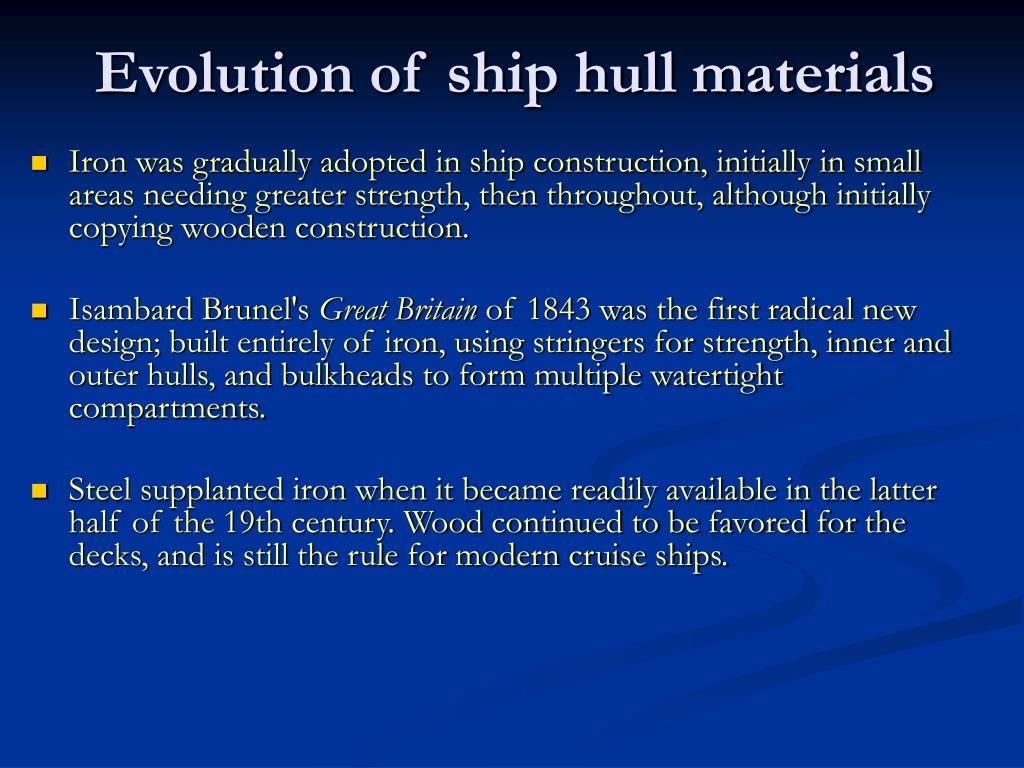 Evolution of ship hull materials • Iron was gradually adopted in ship construction, initially in small areas needing greater strength, then throughout, although initially copying wooden construction. • Isambard Brunel's Great Britain of 1843 was the first radical new design; built entirely of iron, using stringers for strength, inner and outer hulls, and bulkheads to form multiple watertight compartments. • Steel supplanted iron when it became readily available in the latter half of the 19th century. Wood continued to be favored for the decks, and is still the rule for modern cruise ships.