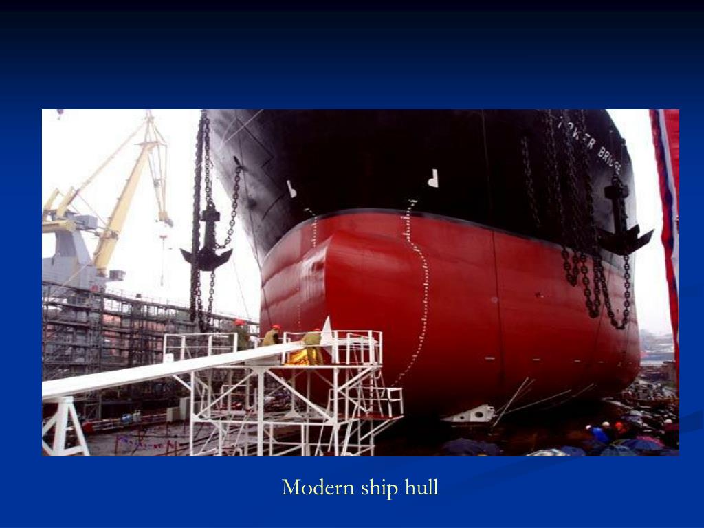 Evolution of ship hull materials • Evidence from ancient Egypt shows that the early Egyptians already knew how to assemble planks of wood into a watertight hull, using treenails to fasten them together, and pitch for caulking the seams. • Viking long ship's developed from an alternate tradition of clinker-built hulls fastened with leather thongs.