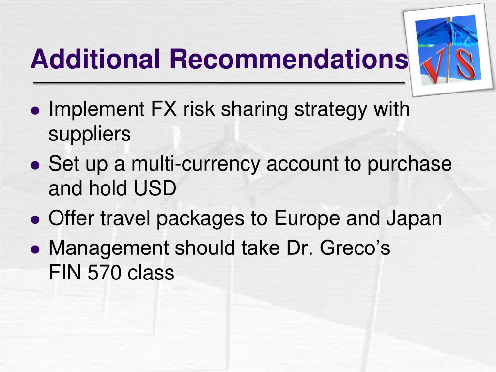 Additional Recommendations • Implement FX risk sharing strategy with suppliers • Set up a multi-currency account to purchase and hold USD • Offer travel packages to Europe and Japan • Management should take Dr. Greco’s FIN 570 class