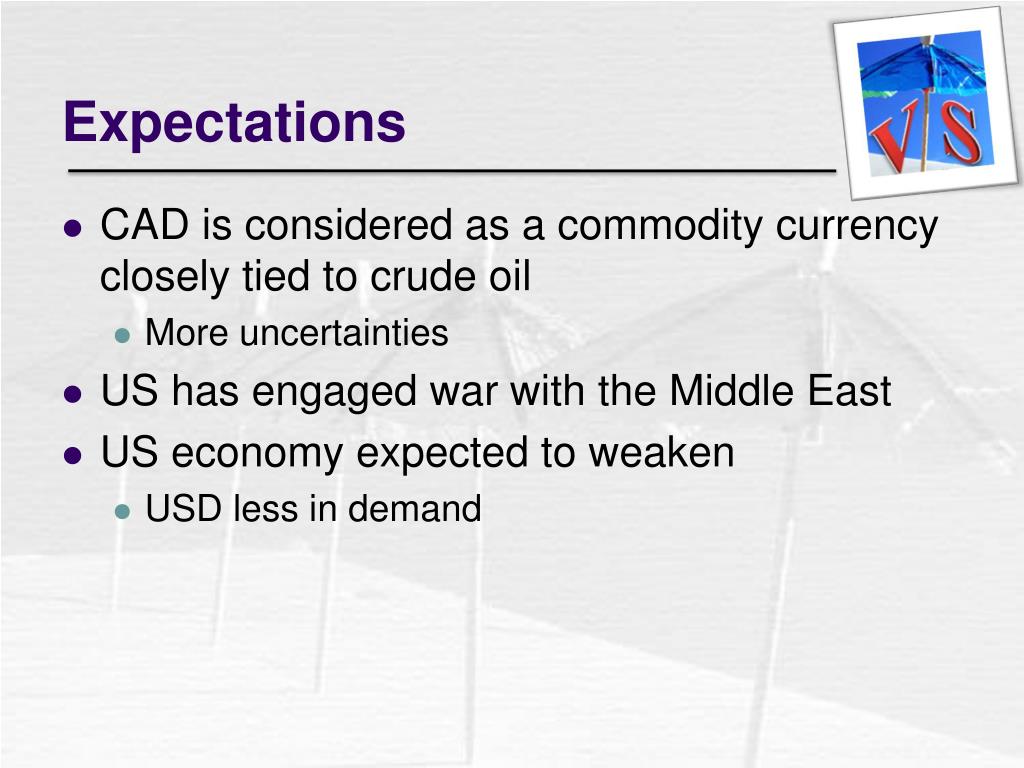Expectations • CAD is considered as a commodity currency closely tied to crude oil • More uncertainties • US has engaged war with the Middle East • US economy expected to weaken • USD less in demand