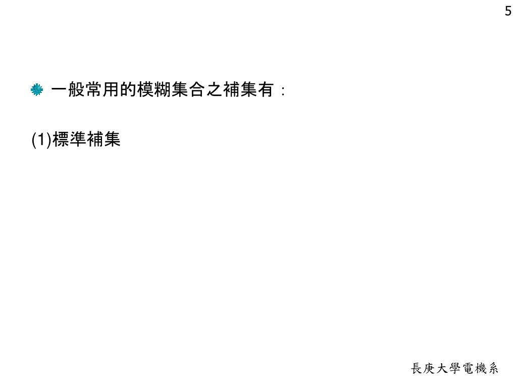 4.6 本章總結 • 模糊集合之三種運算: 補集 (Complement) 交集 (Intersection,又稱 t-基準 (t-norms)) 聯集 (Union,又稱 s-基準 (s-norms) 、t-反基 (t-conorms)) • 模糊集合運算與傳統集合論基本性質之矛盾。