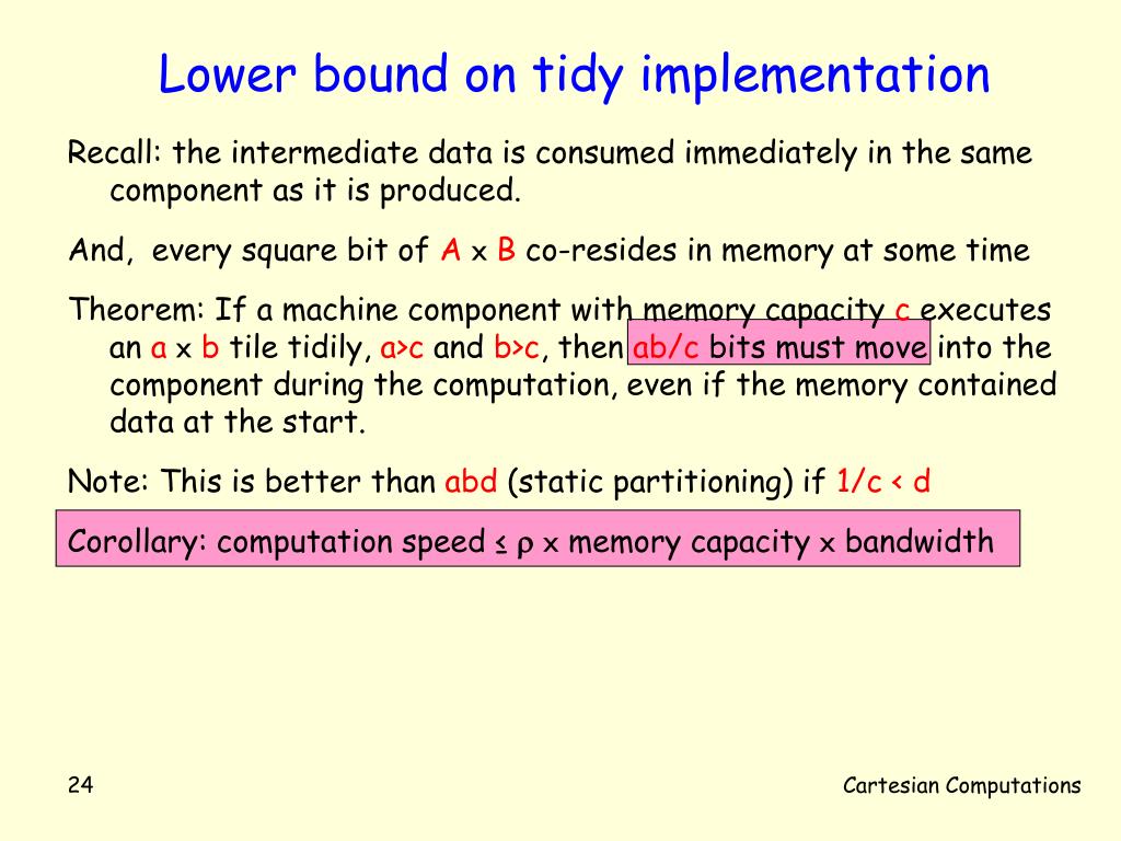 Lower bound on tidy implementation Recall: the intermediate data is consumed immediately in the same component as it is produced. And, every square bit of Ax B co-resides in memory at some time Theorem: If a machine component with memory capacity c executes an ax b tile tidily, a>c and b>c, then ab/c bits must move into the component during the computation, even if the memory contained data at the start. Note: This is better than abd (static partitioning) if 1/c < d Corollary: computation speed ≤ xmemory capacity x bandwidth Cartesian Computations
