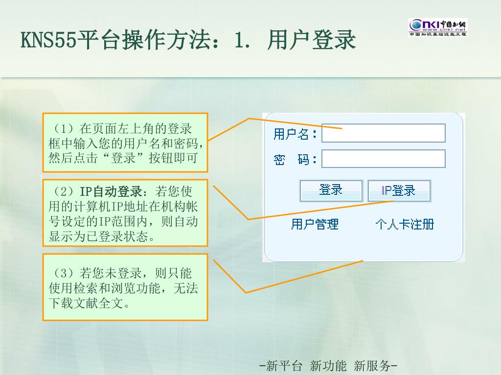KNS55平台操作方法:1. 用户登录 (1)在页面左上角的登录框中输入您的用户名和密码,然后点击“登录”按钮即可 (2)IP自动登录:若您使用的计算机IP地址在机构帐号设定的IP范围内,则自动显示为已登录状态。 (3)若您未登录,则只能使用检索和浏览功能,无法下载文献全文。 -新平台 新功能 新服务- oversea.cnki.net