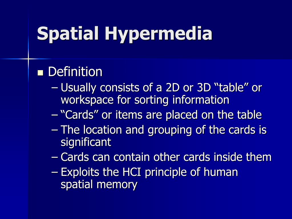 Spatial Hypermedia • Definition • Usually consists of a 2D or 3D “table” or workspace for sorting information • “Cards” or items are placed on the table • The location and grouping of the cards is significant • Cards can contain other cards inside them • Exploits the HCI principle of human spatial memory