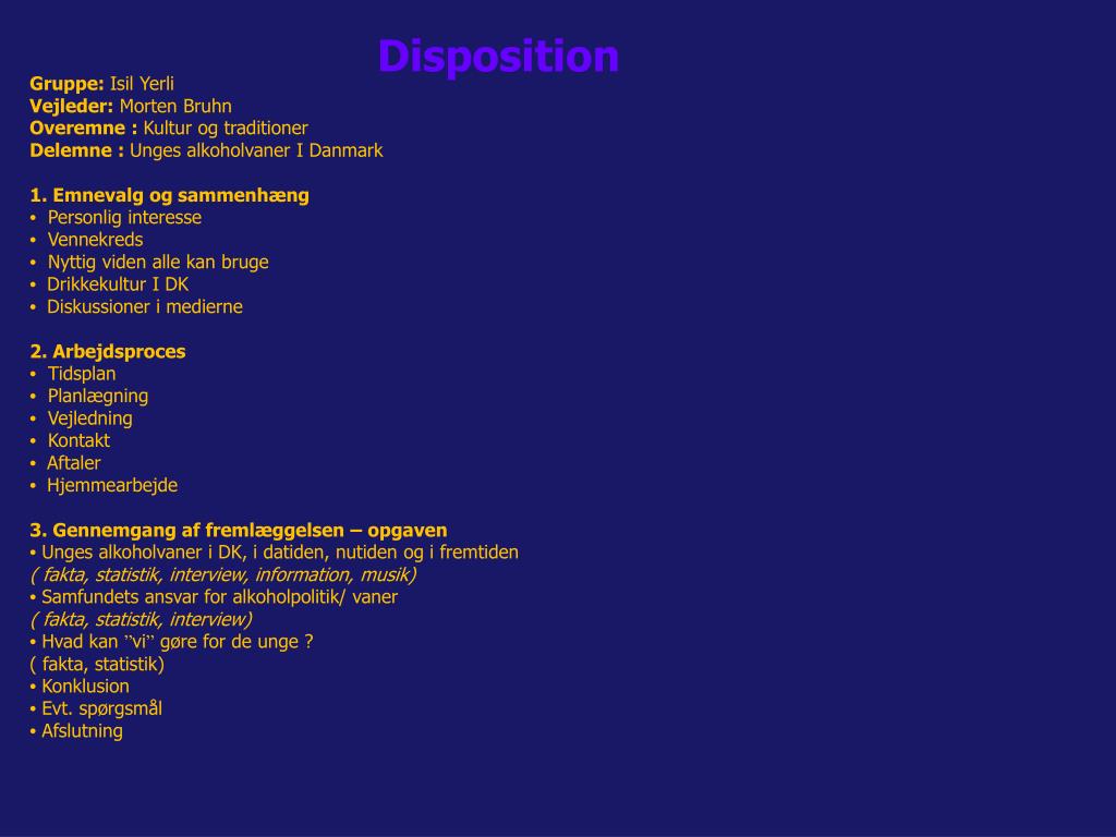 Disposition Gruppe: Isil Yerli Vejleder: Morten Bruhn Overemne : Kultur og traditioner Delemne : Unges alkoholvaner I Danmark 1. Emnevalg og sammenhæng • Personlig interesse • Vennekreds • Nyttig viden alle kan bruge •Drikkekultur I DK •Diskussioner i medierne 2. Arbejdsproces • Tidsplan • Planlægning • Vejledning • Kontakt •Aftaler •Hjemmearbejde 3. Gennemgang af fremlæggelsen – opgaven •Unges alkoholvaner i DK, i datiden, nutiden og i fremtiden ( fakta, statistik, interview, information, musik) •Samfundets ansvar for alkoholpolitik/ vaner ( fakta, statistik, interview) •Hvad kan ”vi” gøre for de unge ? ( fakta, statistik) •Konklusion •Evt. spørgsmål •Afslutning
