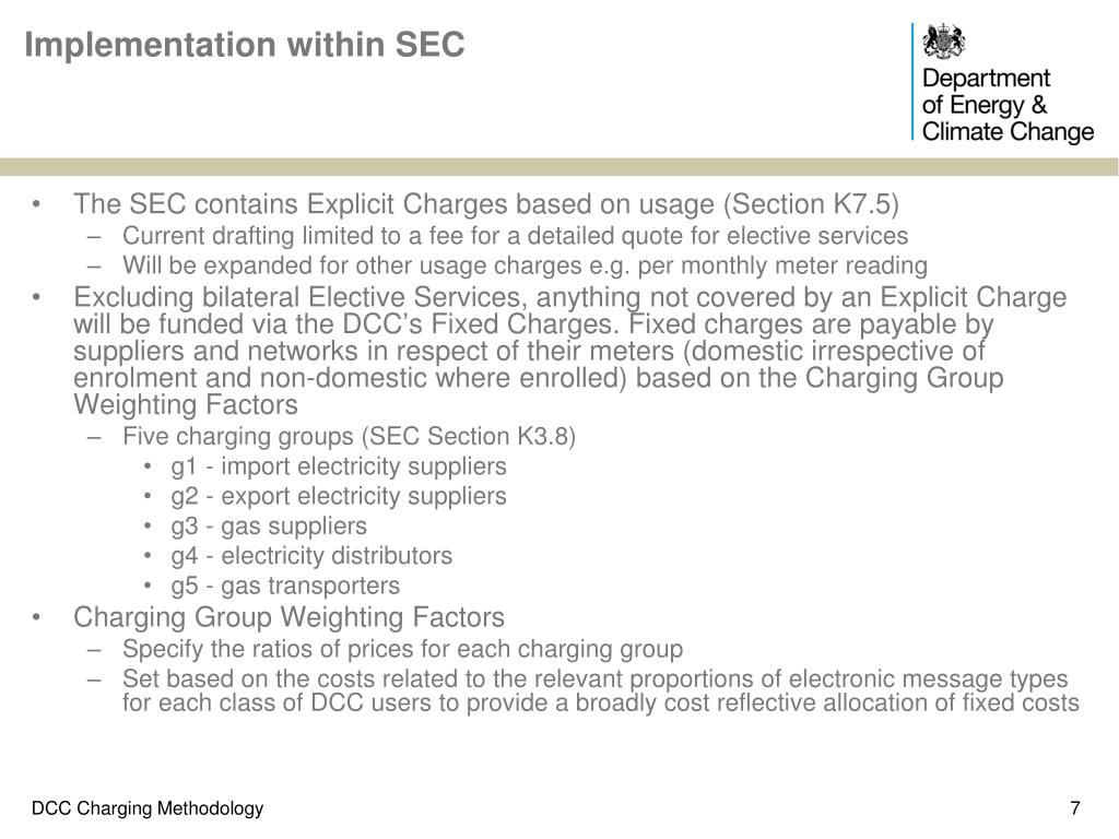 Overview • The DCC / SEC charging regime is designed to ensure the recovery of revenue allowable under the price control licence conditions • Based on the charging objectives • Charges will be mixture of fixed and explicit charges (i.e. usage) to DCC Users • The overall amount based on the selected DCC, DSP and CSPs • Balance between fixed and explicit charges also depends on chosen DCC, DSP and CSPs DCC Charging Methodology