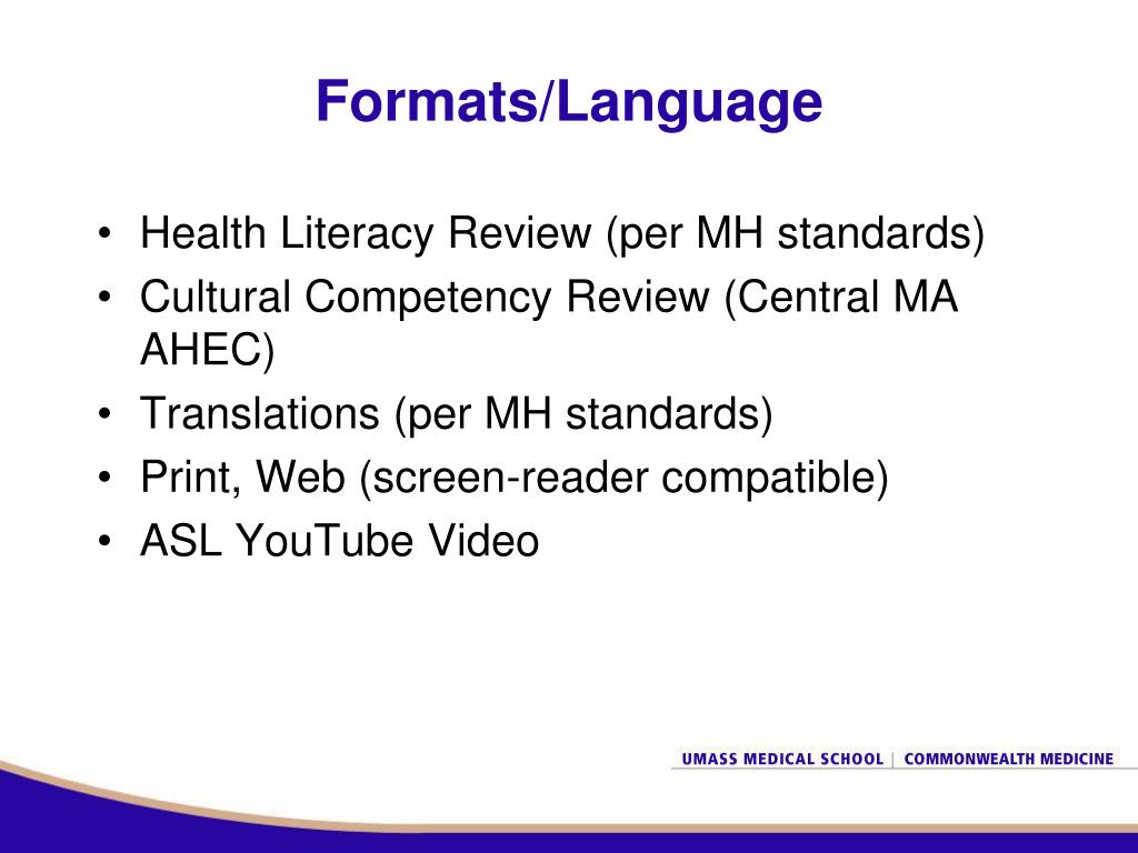 Formats/Language • Health Literacy Review (per MH standards) • Cultural Competency Review (Central MA AHEC) • Translations (per MH standards) • Print, Web (screen-reader compatible) • ASL YouTube Video
