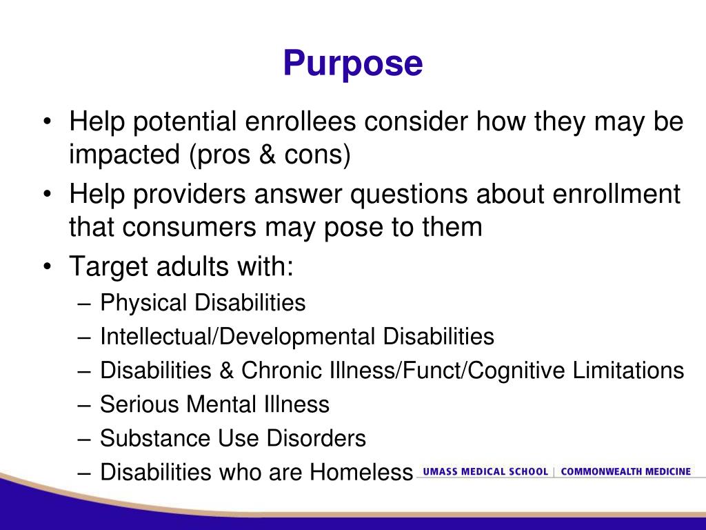 Purpose • Help potential enrollees consider how they may be impacted (pros & cons) • Help providers answer questions about enrollment that consumers may pose to them • Target adults with: • Physical Disabilities • Intellectual/Developmental Disabilities • Disabilities & Chronic Illness/Funct/Cognitive Limitations • Serious Mental Illness • Substance Use Disorders • Disabilities who are Homeless
