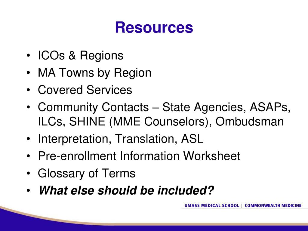 Resources • ICOs & Regions • MA Towns by Region • Covered Services • Community Contacts – State Agencies, ASAPs, ILCs, SHINE (MME Counselors), Ombudsman • Interpretation, Translation, ASL • Pre-enrollment Information Worksheet • Glossary of Terms • What else should be included?