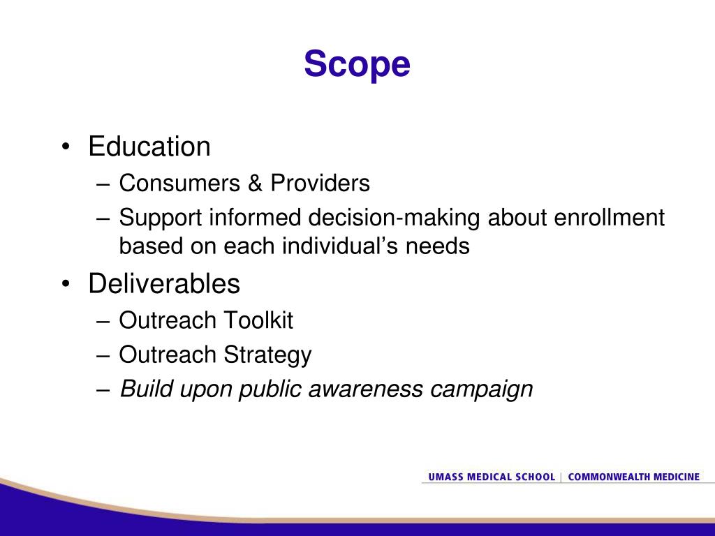 Scope • Education • Consumers & Providers • Support informed decision-making about enrollment based on each individual’s needs • Deliverables • Outreach Toolkit • Outreach Strategy • Build upon public awareness campaign