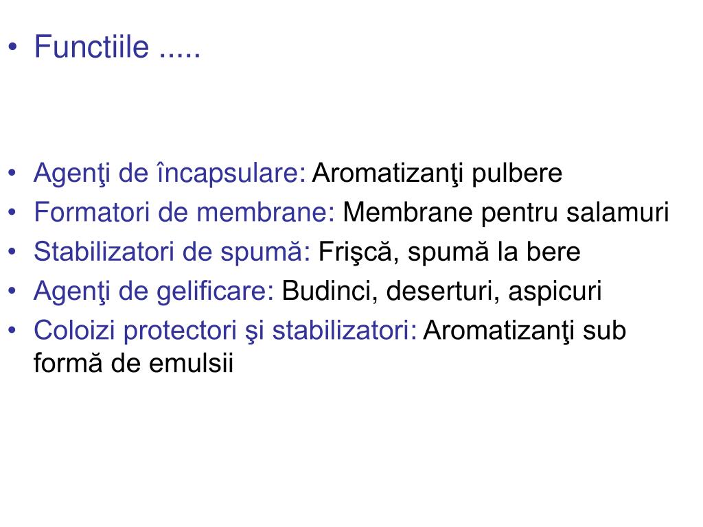 Functiile ..... • Agenţi de încapsulare:Aromatizanţi pulbere • Formatori de membrane:Membrane pentru salamuri • Stabilizatori de spumă:Frişcă, spumă la bere • Agenţi de gelificare:Budinci, deserturi, aspicuri • Coloizi protectori şi stabilizatori:Aromatizanţi sub formă de emulsii
