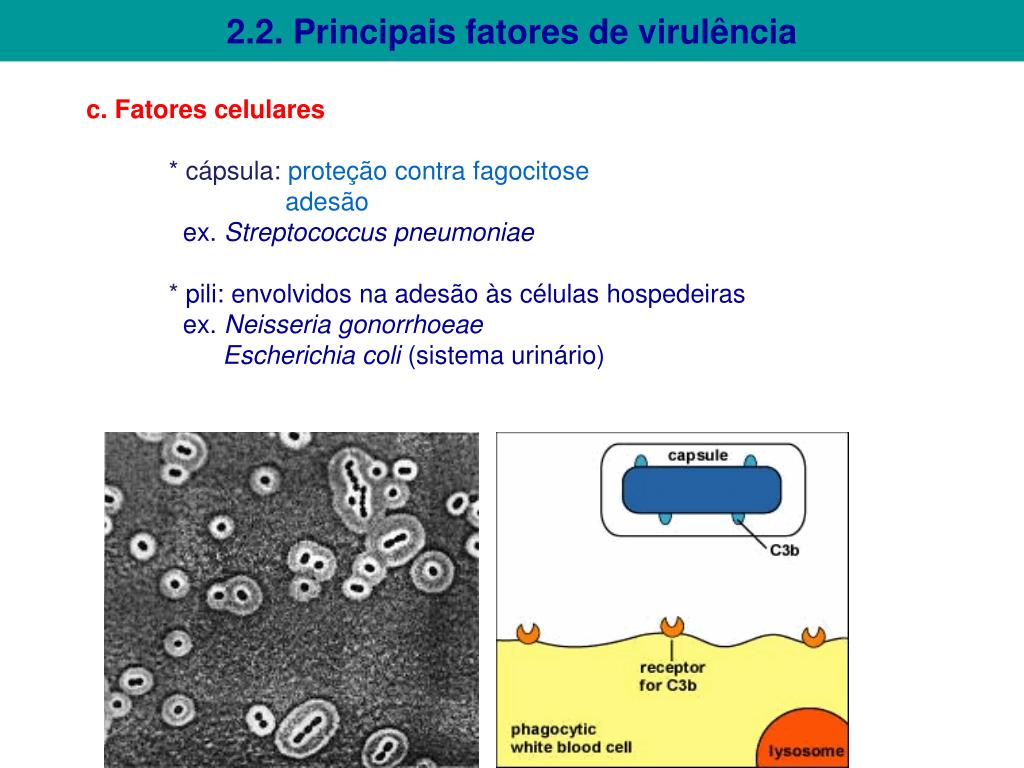 2.2. Principais fatores de virulência c. Fatores celulares * cápsula: proteção contra fagocitose adesão ex. Streptococcuspneumoniae *pili: envolvidos na adesão às células hospedeiras ex. Neisseriagonorrhoeae Escherichiacoli (sistema urinário)