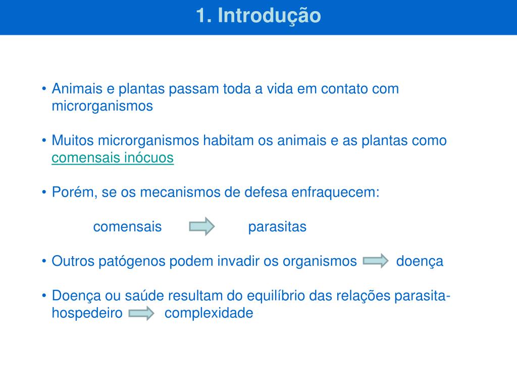 Interações Parasita-Hospedeiro. 1. Introdução. Animais e plantas passam toda a vida em contato com microrganismos Muitos microrganismos habitam os animais e as plantas como comensais inócuos Porém, se os mecanismos de defesa enfraquecem: comensais parasitas