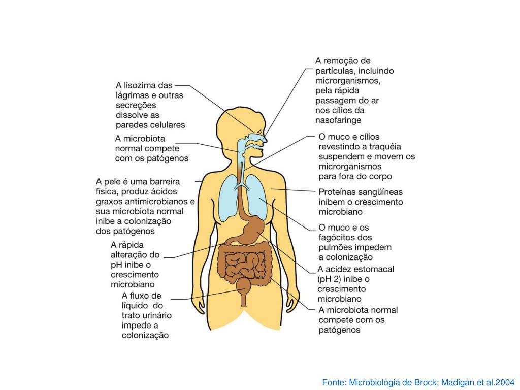 Comensais parasitas Interações microbianas com as membranas mucosas: (a) associação frouxa; (b) adesão; (c) invasão Fonte: Microbiologia de Brock; Madigan et al., 2004