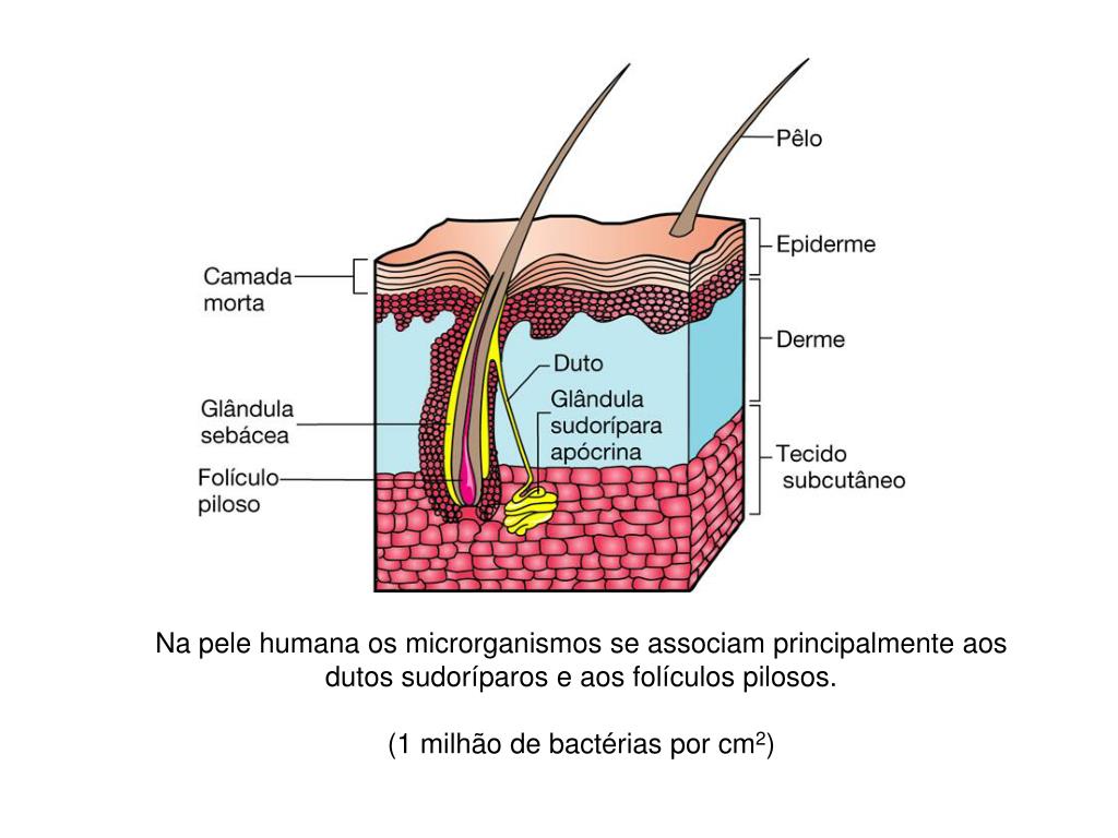 Na pele humana os microrganismos se associam principalmente aos dutos sudoríparos e aos folículos pilosos. (1 milhão de bactérias por cm2)