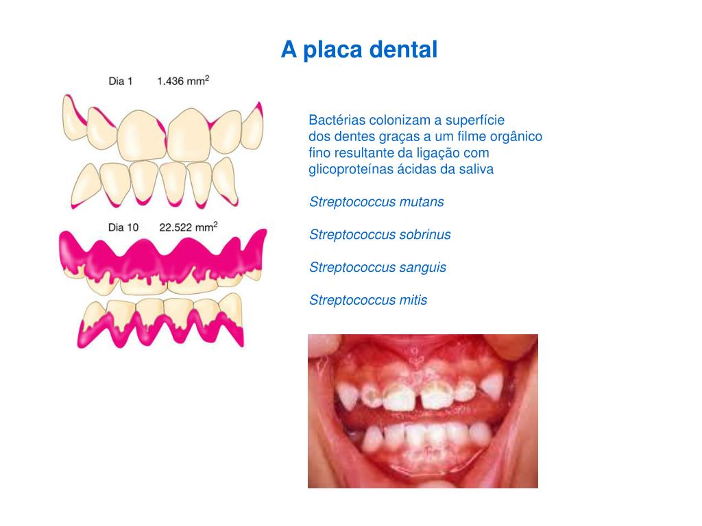 A placa dental Bactérias colonizam a superfície dos dentes graças a um filme orgânico fino resultante da ligação com glicoproteínas ácidas da saliva Streptococcus mutans Streptococcus sobrinus Streptococcus sanguis Streptococcus mitis