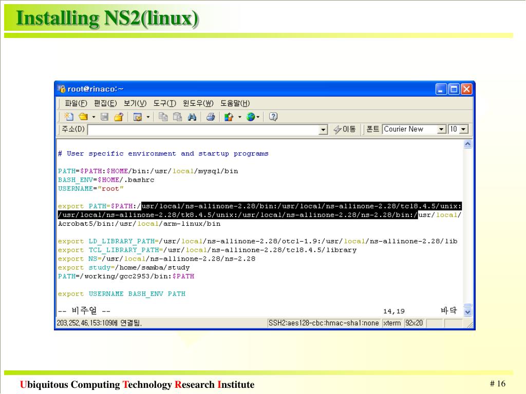 Installing NS2(linux) • Download site • http://www.isi.edu/nsnam/ns/ns-build.html(NS2 공식 홈페이지) • Manual • http://www.isi.edu/nsnam/ns/doc/index.html • Tutorial • http://www.isi.edu/nsnam/ns/tutorial/index.html • http://osiris.sunderland.ac.uk/~ca2stu/netsim/ • NS by Example • http://csl.changwon.ac.kr/ref_doc/ns2/examples/index.html • Member function of objects • http://www-sop.inria.fr/planete/software/ns-doc/ns-current/HIER.html