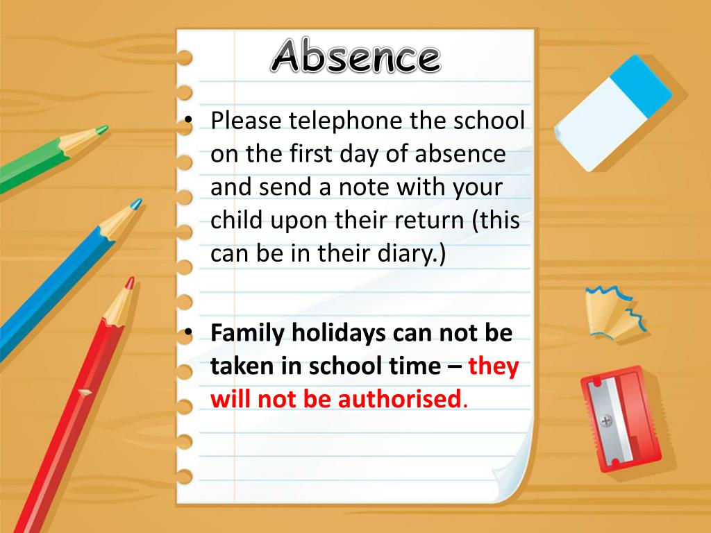 Absence • Please telephone the school on the first day of absence and send a note with your child upon their return (this can be in their diary.) • Family holidays can not be taken in school time – they will not be authorised.