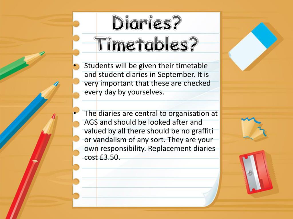 Diaries? Timetables? • Students will be given their timetable and student diaries in September. It is very important that these are checked every day by yourselves. • The diaries are central to organisation at AGS and should be looked after and valued by all there should be no graffiti or vandalism of any sort. They are your own responsibility. Replacement diaries cost £3.50.