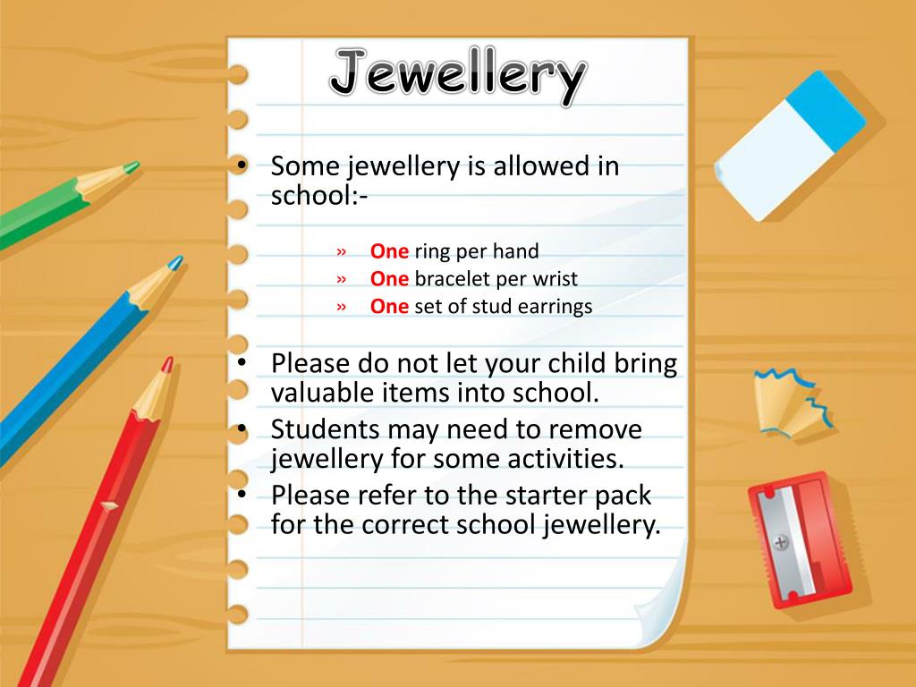 Jewellery • Some jewellery is allowed in school:- • One ring per hand • Onebracelet per wrist • One set of stud earrings • Please do not let your child bring valuable items into school. • Students may need to remove jewellery for some activities. • Please refer to the starter pack for the correct school jewellery.
