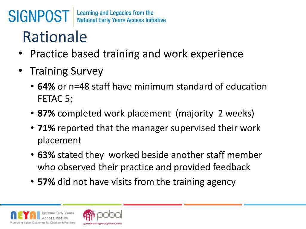 Rationale • Practice based training and work experience • Training Survey • 64% or n=48 staff have minimum standard of education FETAC 5; • 87% completed work placement (majority 2 weeks) • 71% reported that the manager supervised their work placement • 63% stated they worked beside another staff member who observed their practice and provided feedback • 57% did not have visits from the training agency