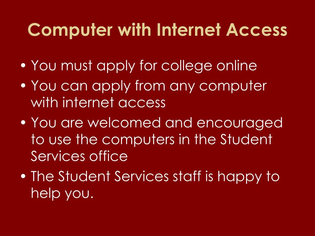 Computer with Internet Access • You must apply for college online • You can apply from any computer with internet access • You are welcomed and encouraged to use the computers in the Student Services office • The Student Services staff is happy to help you.