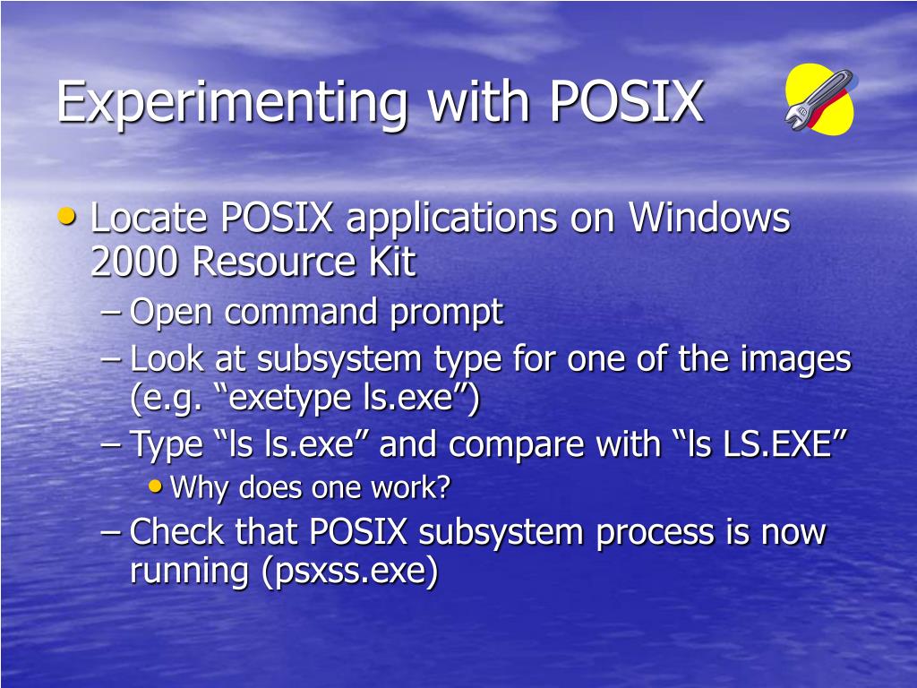 Experimenting with POSIX • Locate POSIX applications on Windows 2000 Resource Kit • Open command prompt • Look at subsystem type for one of the images (e.g. “exetype ls.exe”) • Type “ls ls.exe” and compare with “ls LS.EXE” • Why does one work? • Check that POSIX subsystem process is now running (psxss.exe)