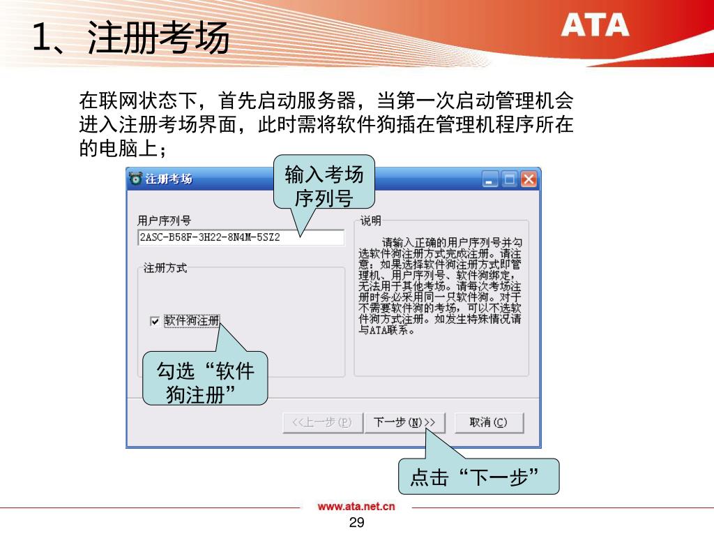1、注册考场 在联网状态下,首先启动服务器,当第一次启动管理机会进入注册考场界面,此时需将软件狗插在管理机程序所在的电脑上; 输入考场序列号 勾选“软件狗注册” 点击“下一步” 29
