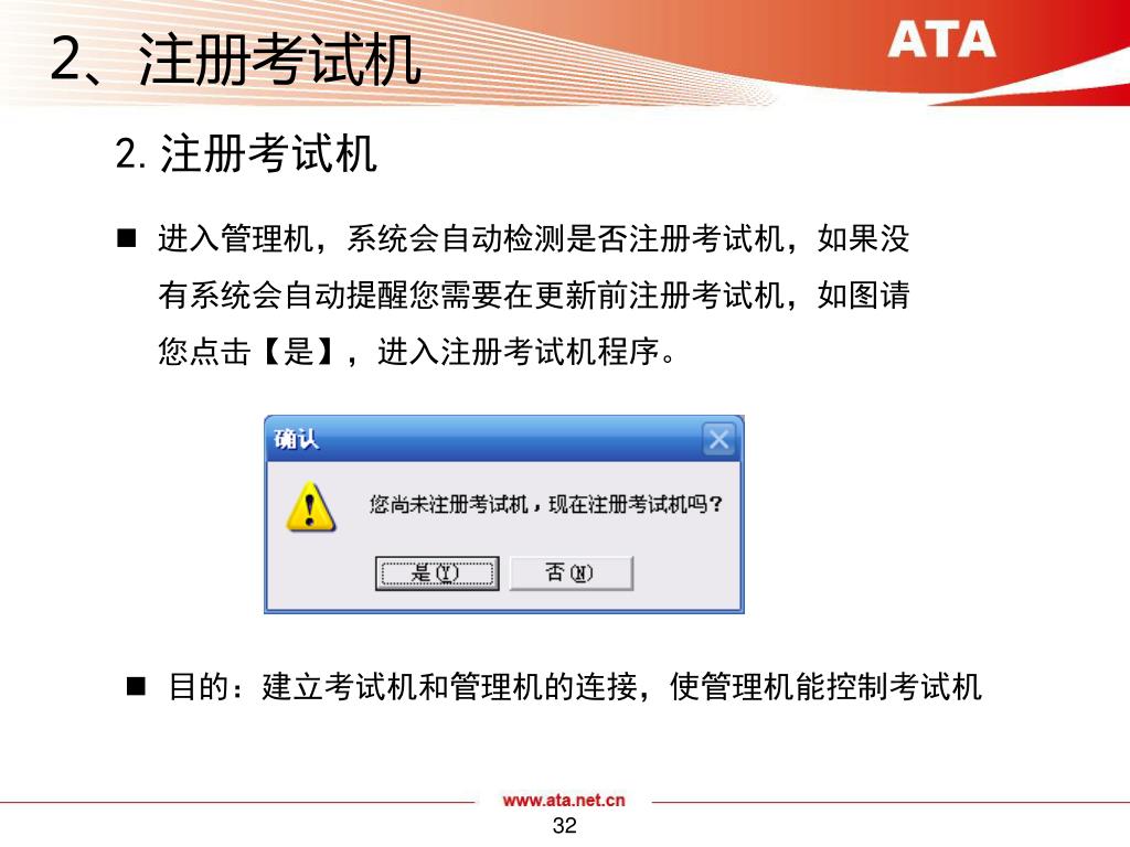 2、注册考试机 2.注册考试机 • 进入管理机,系统会自动检测是否注册考试机,如果没有系统会自动提醒您需要在更新前注册考试机,如图请您点击【是】,进入注册考试机程序。 • 目的:建立考试机和管理机的连接,使管理机能控制考试机 32