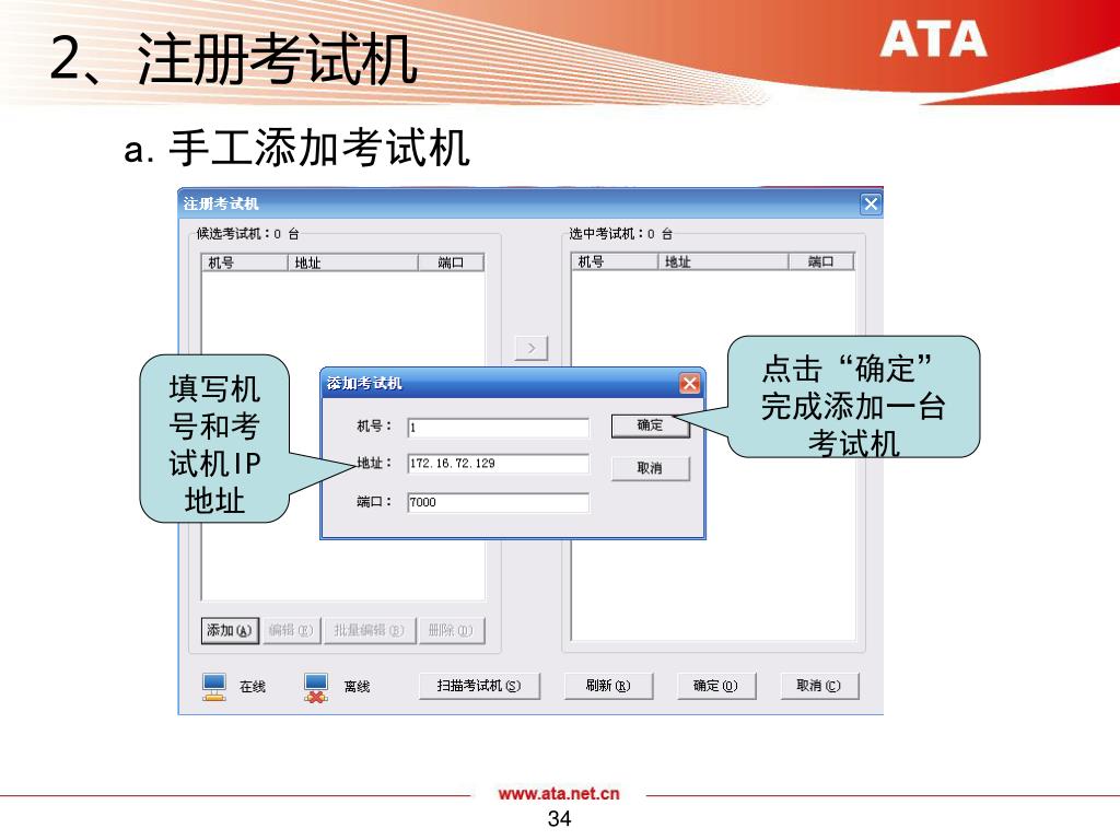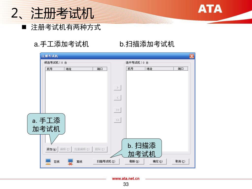 2、注册考试机 • 注册考试机有两种方式 a.手工添加考试机 b.扫描添加考试机 a.手工添加考试机 b.扫描添加考试机 33